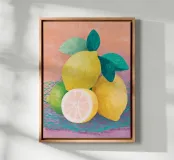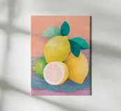 Ein mediterranes Stillleben mit Zitronen und Blattgrün in sanften Pastellfarben wird in einem grafischen Karomuster präsentiert. Diese vintage-inspirierte Illustration bringt einen tropischen Sommerflair in jede Küche und feiert die Frische von Bio-Obst und Gemüse.