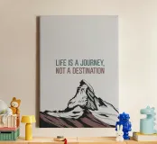 Ein schneebedeckter Berg ist unter einem inspirierenden Zitat abgebildet, das lautet: "Das Leben ist eine Reise, kein Ziel". Das minimalistische Design verwendet sanfte Farben vor einem hellen Hintergrund, um ein Gefühl von Abenteuer und Selbstbetrachtung zu vermitteln.