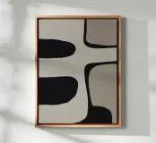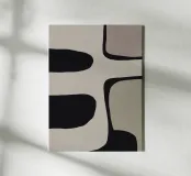 Abstrakte Formen in neutralen Tönen sind in kräftigem Schwarz umrandet und bilden ein Muster aus organischen Formen. Die Komposition hält das Gleichgewicht zwischen leerem und gefülltem Raum und schafft ein Minim