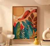 Eine moderne und heitere abstrakte Landschaft mit einer untergehenden Sonne über stilisierten Blättern und Hügeln in einer warmen, erdigen Farbpalette aus Ocker, Terrakotta und Grün. Die Komposition ist ruhig, ausgewogen und anspruchsvoll.