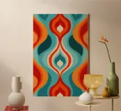 Dieses Kunstwerk ist eine faszinierende optische Illusion und eine Hommage an die Psychedelische Kunst und Op-Art der späten 1960er und frühen 70er Jahre. Geschwungene, fließende Formen in flammendem Rot und warmem Orange treffen auf kühle Töne von Türkis und Blaugrün, was eine dynamische, feurige und zugleich aquatische Spannung erzeugt. Die vertikale Symmetrie und die geschichteten, tropfenförmigen Motive erinnern an ikonische Stoff- und Tapetendesigns dieser Ära. Das Muster erzeugt einen unaufhörlichen visuellen Sog und scheint fast zu atmen. Ein energiegeladener, hypnotischer Blickfang.