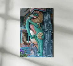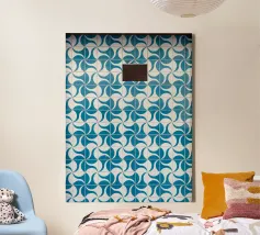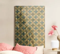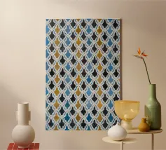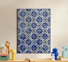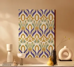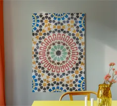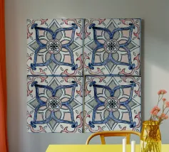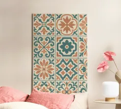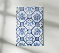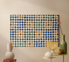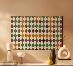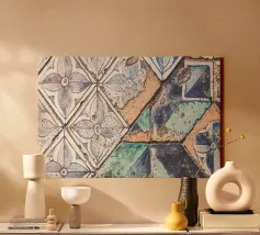 Dieses Kunstwerk zeigt ein markantes Fliesenmuster aus Matosinhos, Portugal, bei dem geometrische Formen und Retro-Farben in perfekter Harmonie zusammenkommen. Das abstrakte Design mit Ocker-, Lavendel-, Oliven- und Cremetönen spiegelt die moderne Ästhetik der Jahrhundertmitte wider und trägt gleichzeitig das kulturelle Erbe der traditionellen portugiesischen Azulejos in sich.