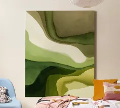 Minimalistisches abstraktes Kunstwerk mit weichen, geschichteten Formen in Salbeigrün, Sand und Cremetönen. Sanfte, fließende Komposition für ruhige, moderne Innenräume.