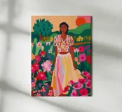 Eine Frau, die einen bunt gemusterten Rock und ein weißes Oberteil trägt, steht während eines warmen, goldenen Sonnenuntergangs freudig in einem leuchtenden Blumenfeld.
