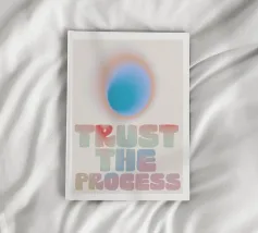 "Die Phrase IS ALL A PART OF THE PROCESS' ist in einem dynamischen, leicht chaotischen Layout mit roter Typografie in Notlage vor einem strukturierten gelben Hintergrund angeordnet, mit einer subtilen Silhouette hinter dem Text. Die raue Textur und die unvollkommenen Buchstabenformen vermitteln ein Gefühl von Authentizität und Widerstandsfähigkeit.",
