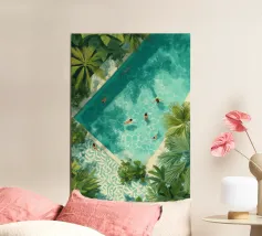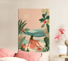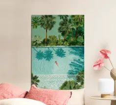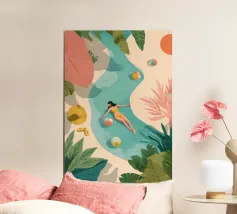 Das Sonnenlicht dringt durch tropische Blätter, während sie friedlich in einem Pool schwimmt und sich völlig entspannt. Die Welt um sie herum verschwindet in sanften Farben und ruhigen Formen - Strandbälle, Sandalen und die Zeit selbst bleiben zurück. Dieses Werk ist ein visuelles Aufatmen und eine Erinnerung daran, innezuhalten, zu atmen und die Ruhe zu genießen.
