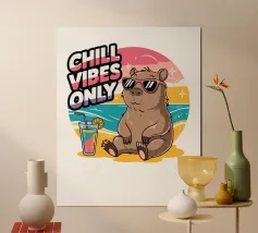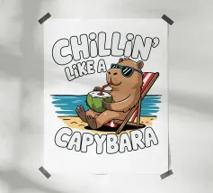 Ein fröhliches Wasserschwein mit Sonnenbrille sitzt auf einer Bank und genießt eine Wassermelone mit tropischem Flair. Der Text darüber lautet "I'M NOT LAZY" und darunter "I'M JUST ON CAPYBARA TIME".