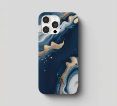 Dieser elegante, abstrakte Hintergrund zeigt fließende Gold- und Silberelemente mit kreisförmigen Akzenten auf einer sattblauen Leinwand und sorgt so für eine beeindruckende visuelle Wirkung, die sich für kreative Projekte eignet.