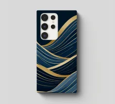 Dieser elegante, abstrakte Hintergrund zeigt fließende Gold- und Silberelemente mit kreisförmigen Akzenten auf einer sattblauen Leinwand und sorgt so für eine beeindruckende visuelle Wirkung, die sich für kreative Projekte eignet.