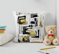 Kühne schwarze Kurven verflechten sich mit einem leuchtenden goldenen Quadrat in der Mitte und schaffen eine dynamische und abstrakte Komposition. Das Zusammenspiel von dunklen und hellen Kontrasten verleiht dem Design Tiefe und Bewegung.