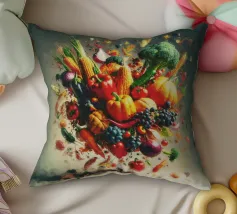 Eine skurrile Darstellung eines historischen Gebäudes mit komplizierten Details, umgeben von einem leuchtenden Himmel voller schwebender Früchte und Gemüse. Die surreale Komposition vermischt Architektur und Fantasie zu einem kreativen, farbenfrohen Bild.