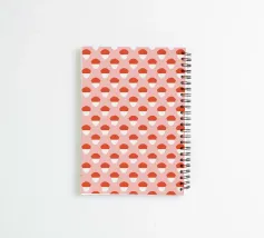 Ein sich wiederholendes Muster mit roten und weißen geometrischen Formen auf einem zartrosa Hintergrund. Jede Form ähnelt einem Halbkreis, der auf einem Trapez gestapelt ist, wodurch ein kohärentes und rhythmisches Design entsteht.