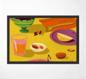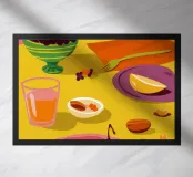 Ein Stillleben eines Frühstücks oder Brunch für zwei Personen, mit Tellern und Gläsern mit Orangensaft auf einem gelben Tisch. Die Szene ist eine einfache, süße und intime Darstellung einer gemeinsamen Mahlzeit.