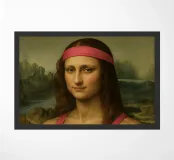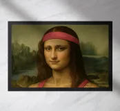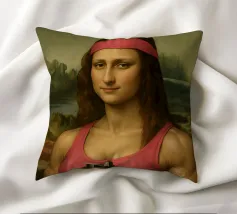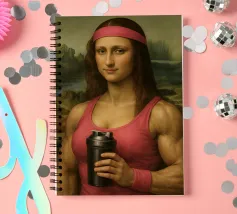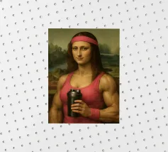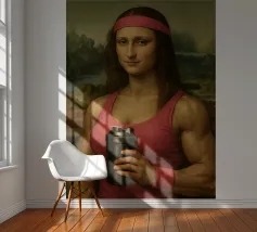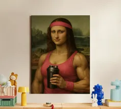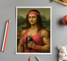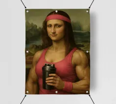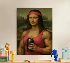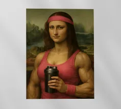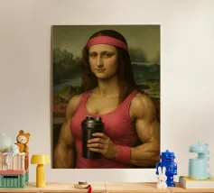 Funny portrait of Mona Lisa as a Renaissance-style muscular woman in a pink headband. Her body is muscular: broad, well-defined shoulders and large, veined biceps visible beneath a sleeveless pink tank top. Mona Lisa wears a matching pink wristband and holds a black protein shaker in her hand. The humorous art contrasts the smooth, serene facial expression and traditional portrait style with modern athletic and fitness elements.
