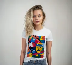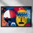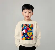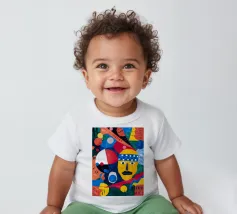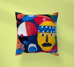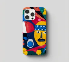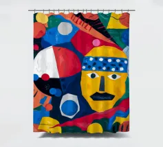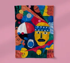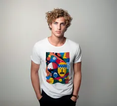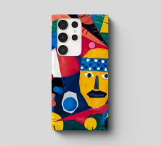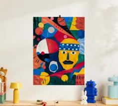 In "Geometric Whimsy" wird die überschwängliche Energie der abstrakten Kunst durch ein Kaleidoskop geometrischer Formen und lebhafter Farben eingefangen. Kreise, Dreiecke und Rechtecke tanzen in einer harmonischen Sinfonie aus Blau, Rot, Gelb, Grün und Orange über die Leinwand. Im Mittelpunkt steht ein stilisiertes gelbes Gesicht, das mit einem blau-weiß gemusterten Stirnband, schwarzen Augen und einem markanten schwarzen Schnurrbart geschmückt ist und der Komposition einen Hauch von spielerischem Charakter verleiht.