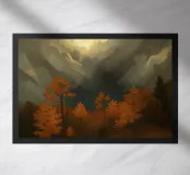 Sattes orangefarbenes und goldenes Laub schmückt die Landschaft, während die Sonne durch die Wolken lugt. Ein ruhiger Weg schlängelt sich durch die Bäume und spiegelt die Schönheit des Herbstes wider.