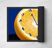 Eine leuchtend orangefarbene Scheibe wird kreativ verwendet, um ein Zifferblatt zu imitieren, auf dessen Oberfläche Zahlen und Uhrzeiger gezeichnet sind. Diese surreale Komposition steht in starkem Kontrast zu einem tiefblauen Hintergrund.
