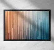 Dieses auffallende abstrakte Werk fängt einen schönen und ruhigen Übergang ein, mit einem sanften Farbverlauf, der von warmen, sonnengeküssten Tönen auf der linken Seite zu kühlen, tiefblauen Tönen auf der rechten Seite übergeht. Die Komposition wird durch eine Reihe von vertikalen Linien bestimmt, die in Länge und Deckkraft variieren und ein Gefühl von dynamischer Bewegung und Fluss erzeugen. Dieses Kunstwerk erweckt ein Gefühl von ruhiger Kontemplation und moderner Eleganz, was es zu einer perfekten Ergänzung für jeden zeitgenössischen Raum macht. Es ist eine visuelle Metapher für die parallele Reise von Tag und Nacht, Wärme und Kühle oder Morgengrauen und Abenddämmerung.