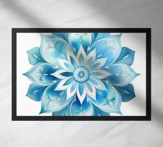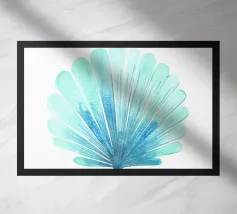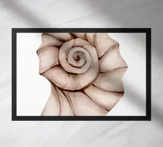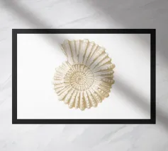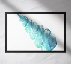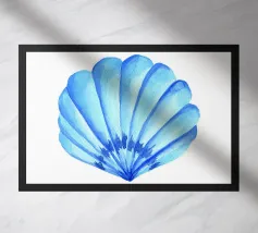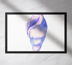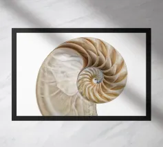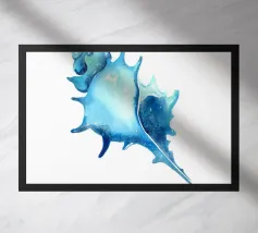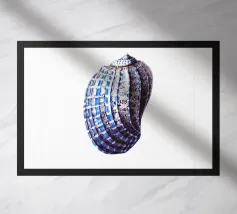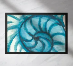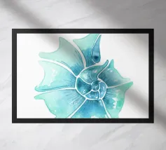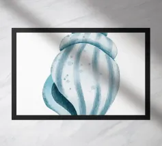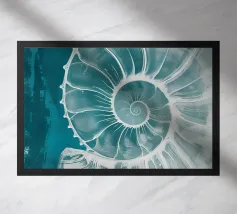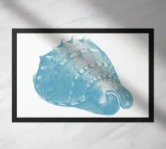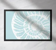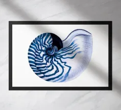 Eine blaue Nautilus-Muschel in sanften Blautönen vor einem weißen Hintergrund strahlt Ruhe und Ästhetik aus. Ihre spiralförmige Form und schlichte Schönheit laden den Betrachter ein, die Geheimnisse der Unterwasserwelt zu erkunden. Ein zeitloses Kunstwerk im maritimen Stil.
