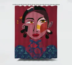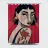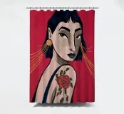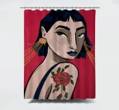 This painting depicts a person with a tattoo of a rose on their shoulder. The person is wearing large, golden earrings, and the background is a striking red, emphasizing the bold and expressive nature of the artwork.