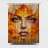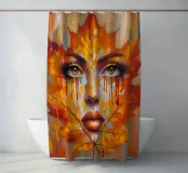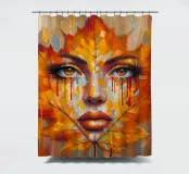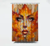 Portrait painting in a striking artistic composition where a woman's face is seamlessly blended with vibrant autumn leaves. The leaves, primarily in hues of orange, yellow, and red, form the contours of her face, creating a mask-like effect.