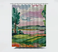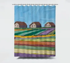 A scenic view of rolling patchwork fields rendered in bold pastels, creating a dreamlike landscape.