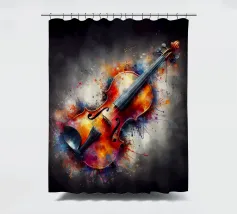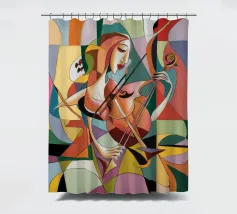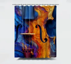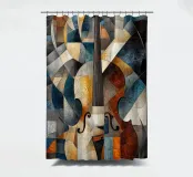 Ein beeindruckendes abstraktes Kunstwerk, das eine Geige im kubistischen Stil darstellt, mit sich überschneidenden geometrischen Formen und einer reichen Farbpalette aus Erd-, Blau- und Goldtönen. Die Komposition betont Textur, Tiefe und Bewegung.