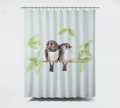 A watercolor drawing of two Java sparrows. They sit next to each other on a long stick and touch each other with the tips of their beaks.