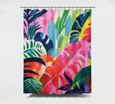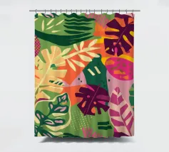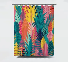 A dense, colorful pattern of overlapping tropical leaves and abstract shapes in bright hues of yellow, pink, blue, and green, creating a joyful, energetic design.