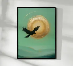 Ein ruhiges und zugleich lebendiges Kunstwerk, das weiche Hügel in frischen Grüntönen und goldgelben Akzenten zeigt. Die Szene erinnert an eine sanfte Morgendämmerung über einer idealisierten Landschaft, perfekt für minimalistische Wohnräume, moderne Drucke oder digitale Anwendungen mit natürlichem Flair.
