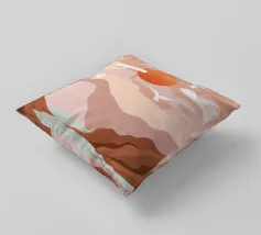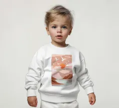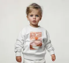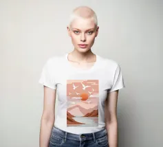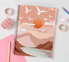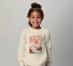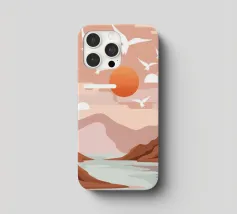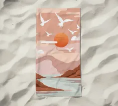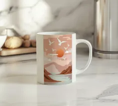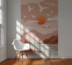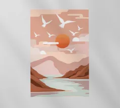 Eine heitere Landschaftsillustration mit Möwen, die über ein ruhiges Meer der untergehenden Sonne entgegenfliegen, mit Bergen im Hintergrund, alles in einer weichen, warmen Farbpalette.