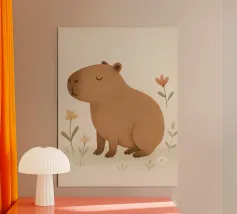 Eine verspielte Szene mit Wasserschweinen, die sich wie kleine Kinder im Kindergarten versammeln und sanften Humor und Wärme verbreiten. Sanfte Farben und charmante Details machen es perfekt für Kinderzimmer, Kindergärten oder verspielte Räume, die Ruhe, Neugier und Zusammengehörigkeit zelebrieren.