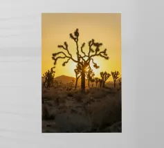 Hohe Josuabäume ragen aus dem sandigen Boden, ihre verdrehten Äste ragen wie riesige Kandelaber in alle Richtungen. Die trockene Erde ist mit Steinen, robusten Sträuchern und goldenen Sandflecken übersät. In der Ferne schimmern die niedrigen Berge in der Hitze. Die Luft ist heiß und trocken, erfüllt von der ruhigen Stille der weiten, offenen Landschaft.