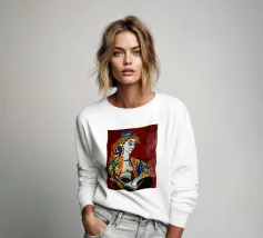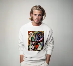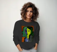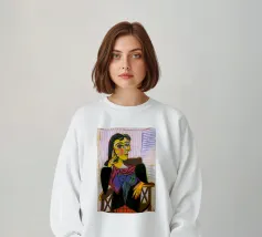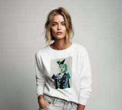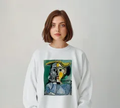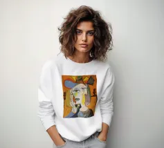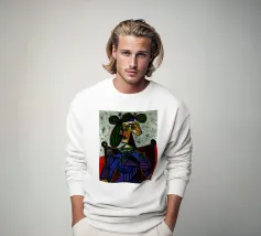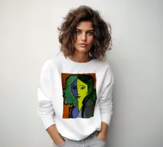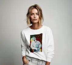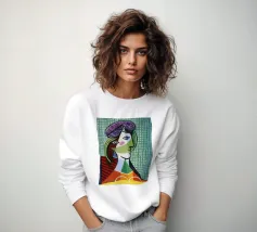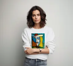 Tauchen Sie ein in die komplexe Schönheit dieses digitalen Posters, einer lebendigen Hommage an Picassos kubistische Meisterwerke. Das Kunstwerk zeigt eine sitzende Frau mit einem markanten gestreiften Hut, die mit fragmentierten Gesichtszügen und mehreren Perspektiven dargestellt ist. Ihre blau getönte Haut kontrastiert mit den warmen Gelb-, Rot- und Violetttönen ihrer gemusterten Kleidung und des Hintergrunds, wodurch ein visuell reichhaltiger Wandteppich entsteht. Dieses hochwertige Digitalposter mit einer Auflösung von 7000x5000 Pixeln bei 300 dpi fängt die komplizierten Details und den bahnbrechenden Stil perfekt ein und macht es zu einem außergewöhnlichen Blickfang für jede moderne Kunstsammlung.