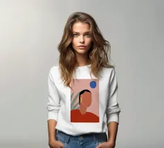 Ein schönes, stilisiertes Porträt von zwei Frauengesichtern im Profil, die sich leicht überlappen. Die warmen, weichen Farben und der gestreifte Hintergrund schaffen ein sanftes und intimes Kunstwerk über Verbindung und Identität.