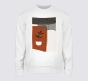 Das minimalistische Design zeigt eine einfache Topfpflanze mit dunklen Blättern vor abstrakten, sich überschneidenden Formen in erdigen Rot-, Grau- und Weißtönen. Die klaren Linien und kräftigen Farbblöcke schaffen eine moderne, beruhigende Ästhetik.