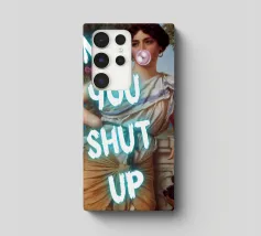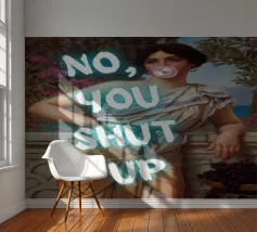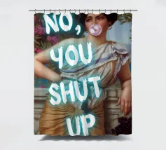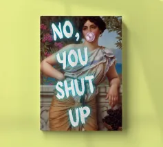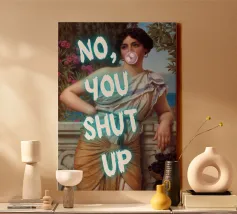 Setzen Sie ein trotziges und humorvolles Statement mit "No, You Shut Up!". Dieser fesselnde Pop-Art-Druck verbindet auf brillante Weise klassische Schönheit mit einer modernen, frechen Erwiderung. Es zeigt eine ruhige klassische Figur, elegant drapiert und in selbstbewusster Pose, die spielerisch eine glänzende Bubblegum-Blase ausbläst. Der fette, leuchtend weiße Text "NO, YOU SHUT UP" überlagert das Bild und verwandelt die zeitlose Kunst in einen witzigen Ausdruck modernen Trotzes. Perfekt, um jedem modernen Raum Persönlichkeit und einen Hauch von rebellischem Charme zu verleihen. Hergestellt mit einer außergewöhnlichen Auflösung von 7000x5000 Pixeln und 300 dpi, um eine hohe Qualität zu gewährleisten.