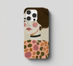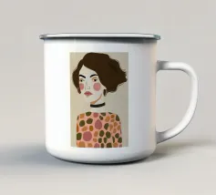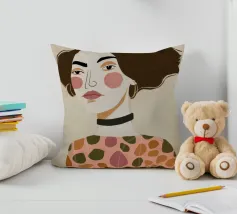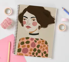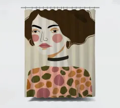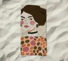 Dieses Gemälde zeigt eine Person mit kurzen, dunklen Haaren, die zu einer Welle gestylt sind. Sie trägt ein Kleid mit Retro-Muster, das Kreise und Rauten in Rosa-, Braun- und Beigetönen aufweist. Der Hintergrund ist einfarbig hellbeige.