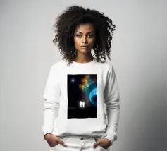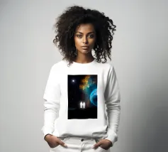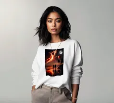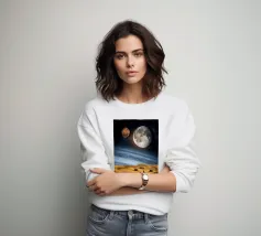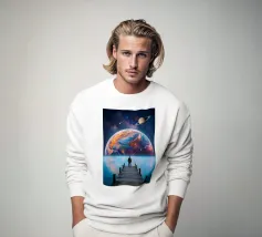 In dieser lebhaften digitalen Illustration steht der Mann in Ehrfurcht vor dem kosmischen Spektakel einer farbenfrohen Planetenfinsternis. Der Planet mit dem Namen Solaris hebt sich groß von der dunklen Weite des Weltraums ab, seine lebhaften Farbtöne wirbeln in einem surrealen Schauspiel aus Farbe und Licht. Der Mann, der sich vor dieser atemberaubenden Kulisse abhebt, ist in der Schönheit des Augenblicks versunken, sein Blick ist auf das sich vor ihm entfaltende Himmelswunder gerichtet. Die Szene fängt die stille Ehrfurcht und das Mysterium des Weltraums ein, denn das Kaleidoskop der Farben des Planeten kontrastiert mit der gewaltigen, unendlichen Schwärze, die ihn umgibt.