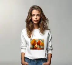 Eine atemberaubende abstrakte Darstellung eines Herbstwaldes mit hohen, dunklen Baumstämmen und goldenem Laub. Der warme, leuchtende Hintergrund unterstreicht die geometrische Komposition und schafft eine ruhige und doch moderne Atmosphäre.