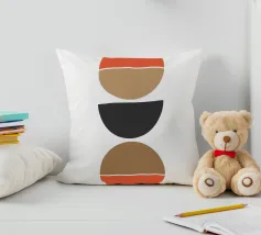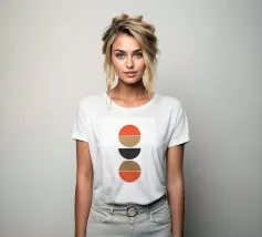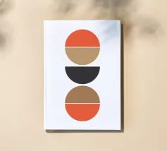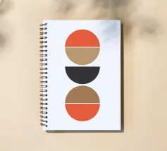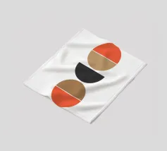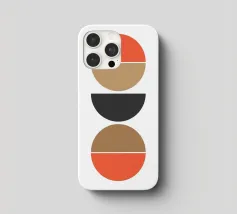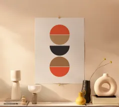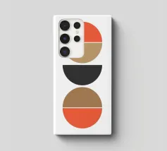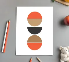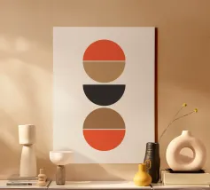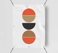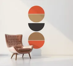 Zwei Sätze von Halbkreisen sind vertikal gestapelt, jeweils in kontrastierenden Farben wie Orange, Beige und Schwarz, wodurch geometrische Muster entstehen. Die Symmetrie und der Farbkontrast vermitteln ein Gefühl von Ausgewogenheit und modernem Design.