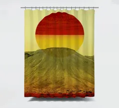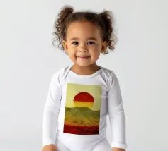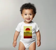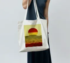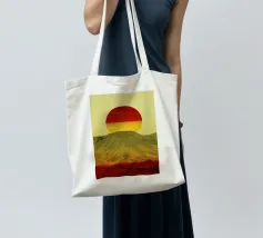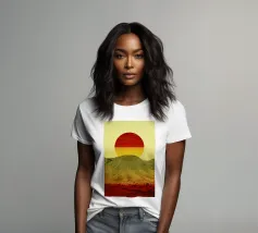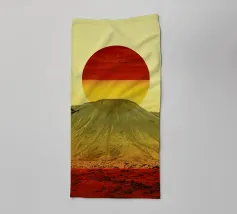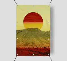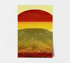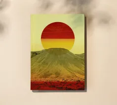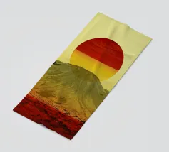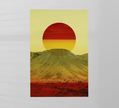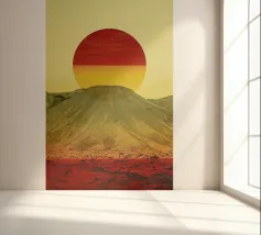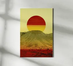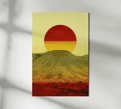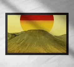 Eine abstrakte Wüstenlandschaft mit Sand im Vordergrund und Bergen in Rot und Gelb im Hintergrund. Minimalistische Japan Gefühl