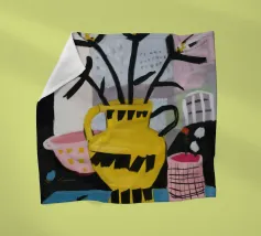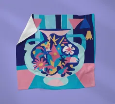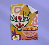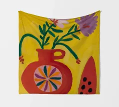 Ein kühnes und grafisches, abstraktes Blumenbild. Stilisierte Blumen und Blätter in einer Schale sind mit starken Umrissen und flächigen Farbflächen dargestellt, wodurch ein dynamisches, modernes und äußerst dekoratives Kunstwerk entsteht.