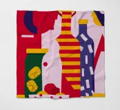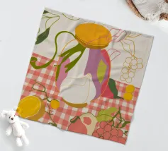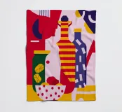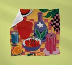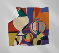 A bold and abstract representation of kitchen essentials like oil and vinegar bottles, rendered in a graphic, deconstructed style with primary colors.