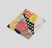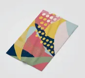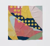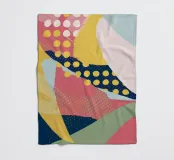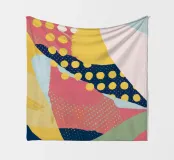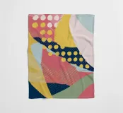 Eine dynamische und farbenfrohe abstrakte Collage mit sich überschneidenden Formen und verschiedenen Mustern, darunter Polka-Dots, Streifen und Volltonfarben, die ein fröhliches, energiegeladenes Gefühl vermitteln.