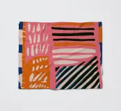 Eine lebhafte und chaotische abstrakte Komposition aus Kritzeleien, Formen und Mustern, darunter Regenbögen und Tupfen. Das Kunstwerk ist eine fröhliche Explosion kreativer Energie und ungehemmten Ausdrucks.