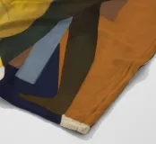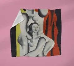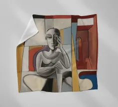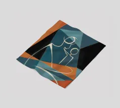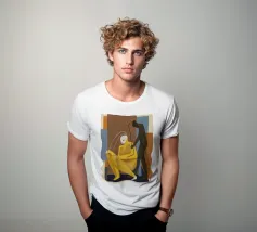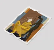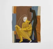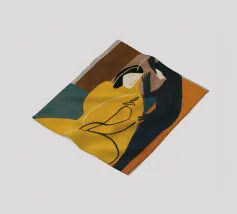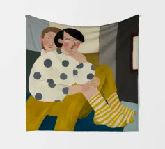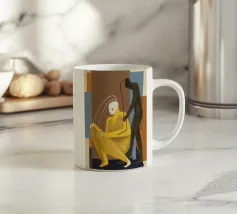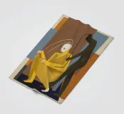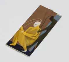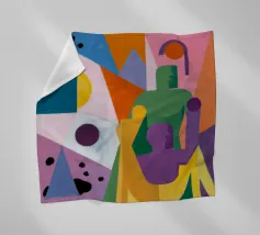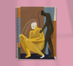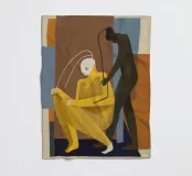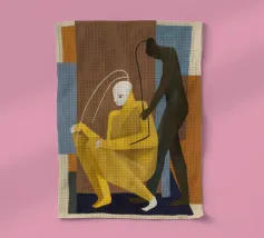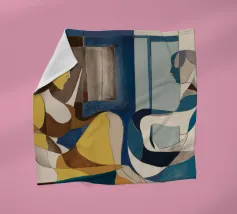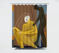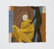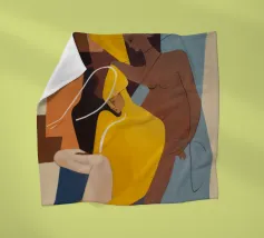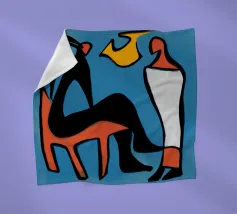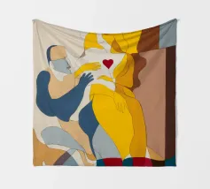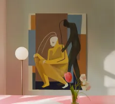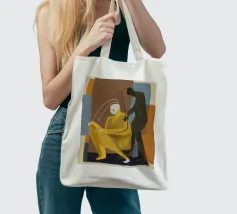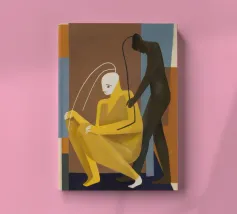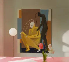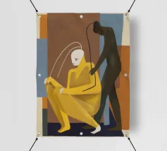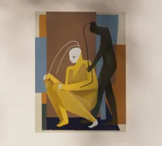 Das Gemälde stellt zwei abstrakte menschliche Figuren dar. Die Figur auf der linken Seite ist sitzend, gelb gemalt und scheint einen zarten weißen Faden zu halten. Die rechte Figur steht, ist in dunkelbraun oder schwarz gemalt und scheint mit der sitzenden Figur zu interagieren. Der Hintergrund besteht aus geometrischen Formen in gedämpften Blau-, Braun- und Beigetönen. Das Zusammenspiel der Farben und Formen schafft ein Gefühl der Bewegung und Verbindung zwischen den Figuren.