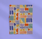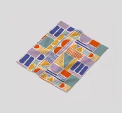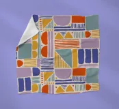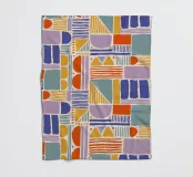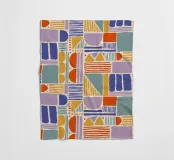Dieses Bild zeigt ein buntes geometrisches Muster, das verschiedene abstrakte Formen und Linien kombiniert. Das Muster umfasst Halbkreise, Rechtecke, Dreiecke sowie vertikale und horizontale Linien in einer Mischung aus sanften und kräftigen Farben, darunter Orange, Gelb, Hellviolett, gedämpftes Blau und Petrol. Die sich wiederholende Anordnung dieser Formen schafft eine spielerische und doch ausgewogene Komposition. Die Verwendung handgezeichneter, ungleichmäßiger Linien verleiht dem strukturierten geometrischen Muster ein Gefühl von organischem Fluss und künstlerischer Textur. Das Gesamtdesi