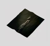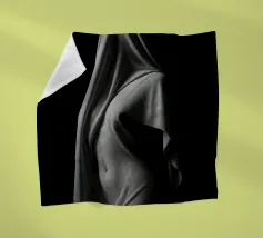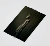 Eine hemdsärmelige humanoide Figur, die eine tierförmige Maske trägt, steht feierlich in schummrigem, dramatischem Licht, das Geheimnis und Symbolik hervorruft. Die Szene ist vor einem schlichten, dunklen Stoffhintergrund platziert, der eine surreale und künstlerische Atmosphäre hervorhebt.