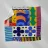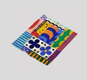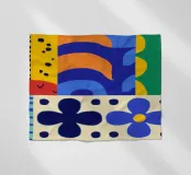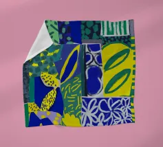A bold and dynamic abstract composition filled with stylized flowers, geometric patterns, and organic shapes in a vibrant primary color palette. The artwork has a playful, folk art feel with a modern twist.
